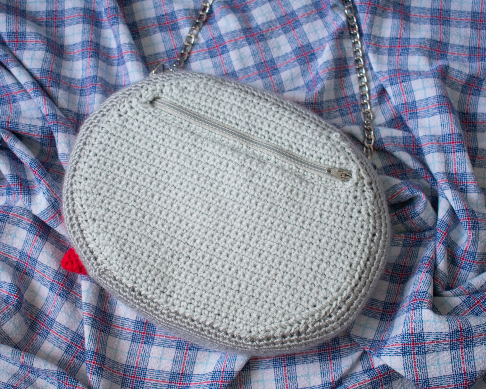 This bag is made from acrylic, cotton, and wool yarns, beads, metal hardware and a zipper pocket to hold all your belongings. It can hold your phone, a small wallet, and a few other small things.